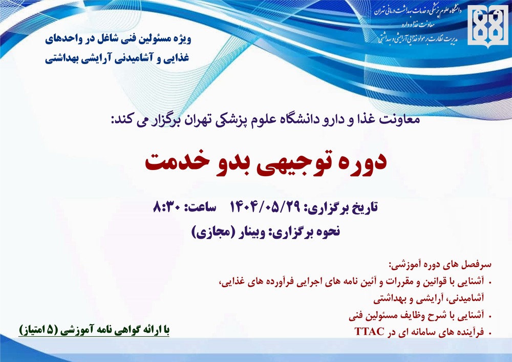 دوره مجازی آموزشی توجیهی بدو خدمت مسئولین فنی واحدهای تولیدی دارای 5 امتیاز آموزشی توسط معاونت غذا و داروی دانشگاه علوم پزشکی تهران برگزار میگردد.
