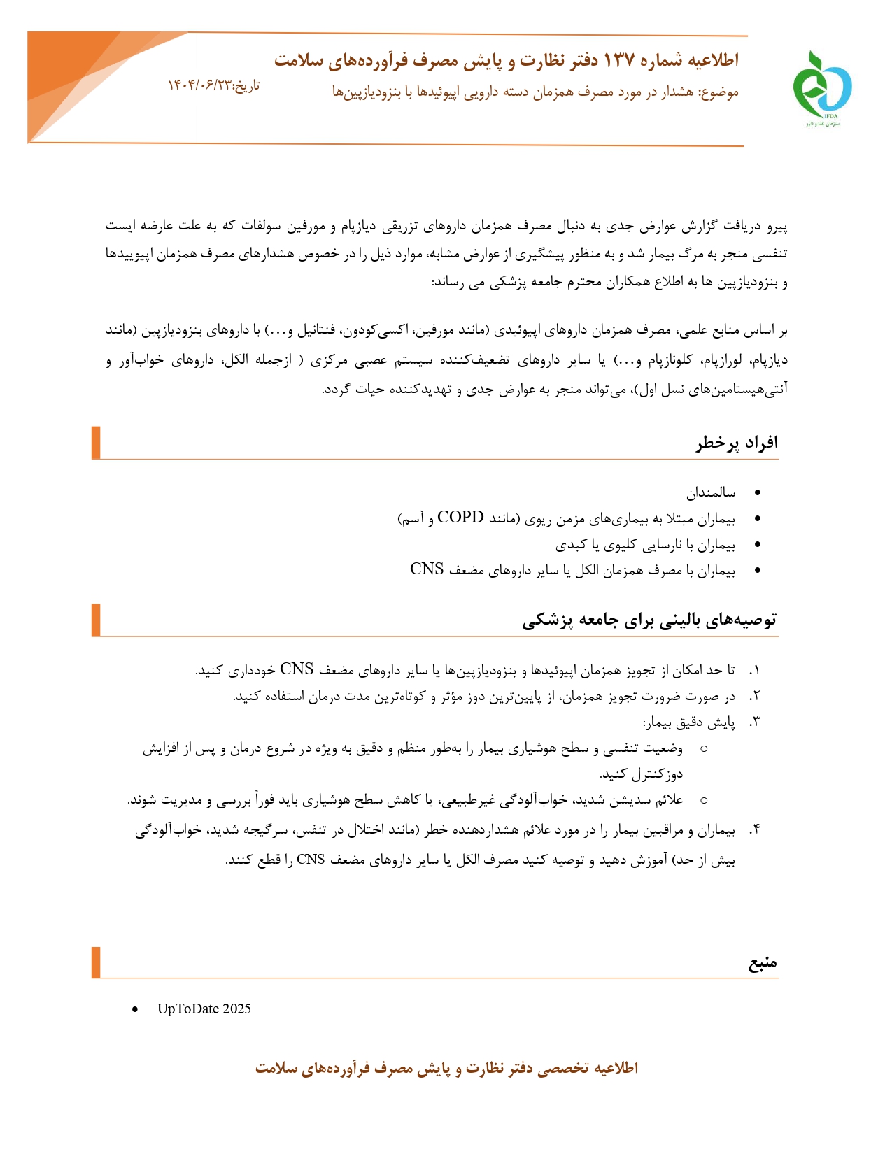 پیرو دریافت گزارش عوارض جدی به دنبال مصرف همزمان داروهای تزریقی دیازپام و مورفین سولفات که به علت عارضه ایست تنفسی منجر به مرگ بیمار شد و به منظور پیشگیری از عوارض مشابه،خواهشمند است به اطلاعیه ذیل توجه فرمایید: