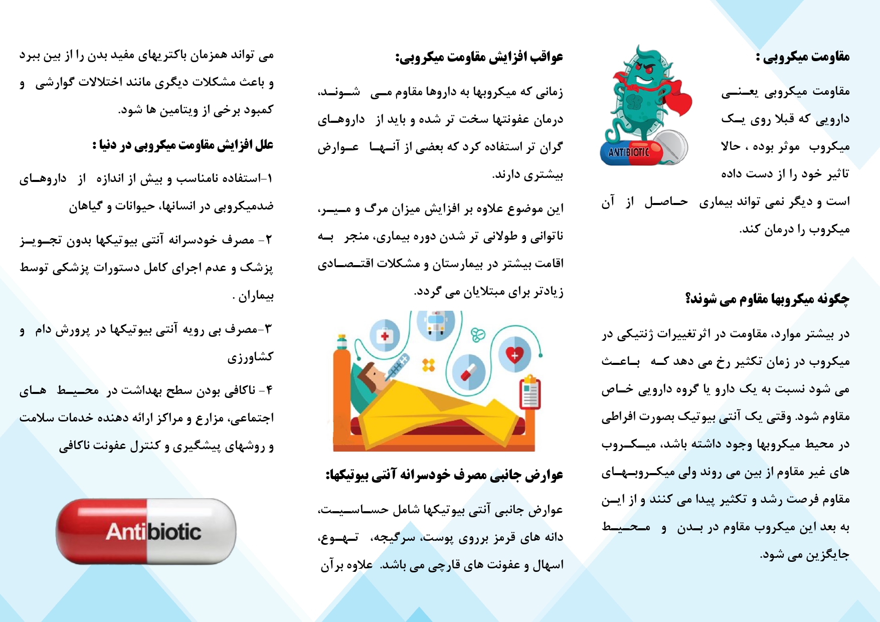 کد خبر : 310506 تاریخ انتشار : 1404/08/28 - 08:03 بازدیدکنندگان : 81 پمفلت پزشکی و دارویی پیشگیری از مقاومت میکروبی مقاومت میکروبی یعنی دارویی که قبلا روی یک میکروب موثر بوده، حالا تاثیر خود را از دست داده است و دیگر نمی تواند بیماری حاصل از آن میکروب را درمان کند. کپی
