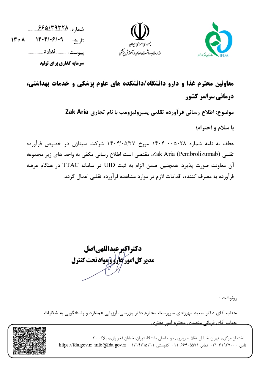 اطلاع رسانی فرآورده تقلبی پمبرولیزومب با نام تجاری Zak Aria فرآورده پمبرولیزومب با نام تجاریZak Aria شرکت سیناژن توسط مدیر کل امور دارو و مواد تحت کنترل اطلاع رسانی شد. دریافت اطلاع رسانی فرآورده تقلبی پمبرولیزومب با نام تجاری Zak Aria کد خبر : 303951 کپی کلمات کلیدی اطلاع_رسانی_فرآورده_تقلبی_پمبرولیزومب_با_نام_تجاری_zak_ariaمعاونت_غذا_و_دارو