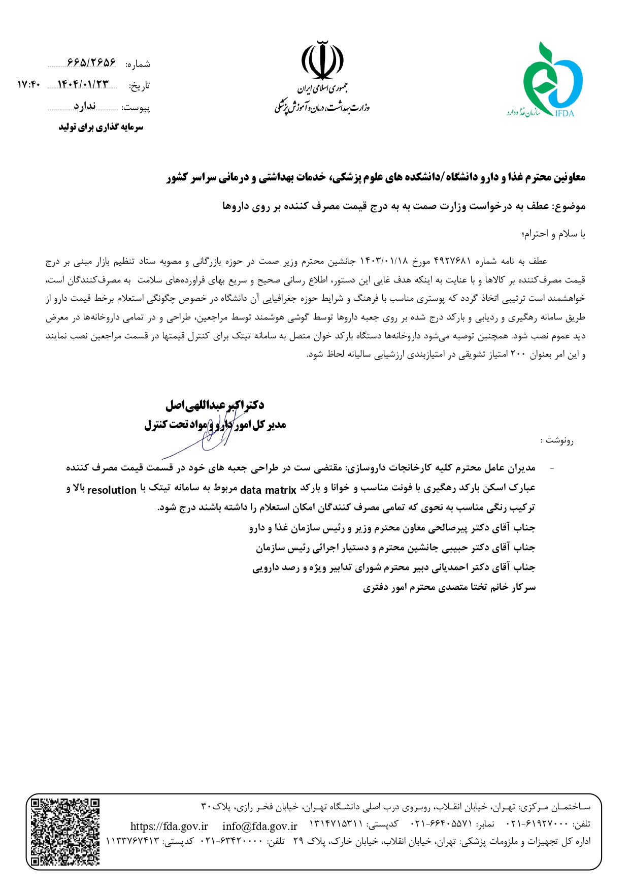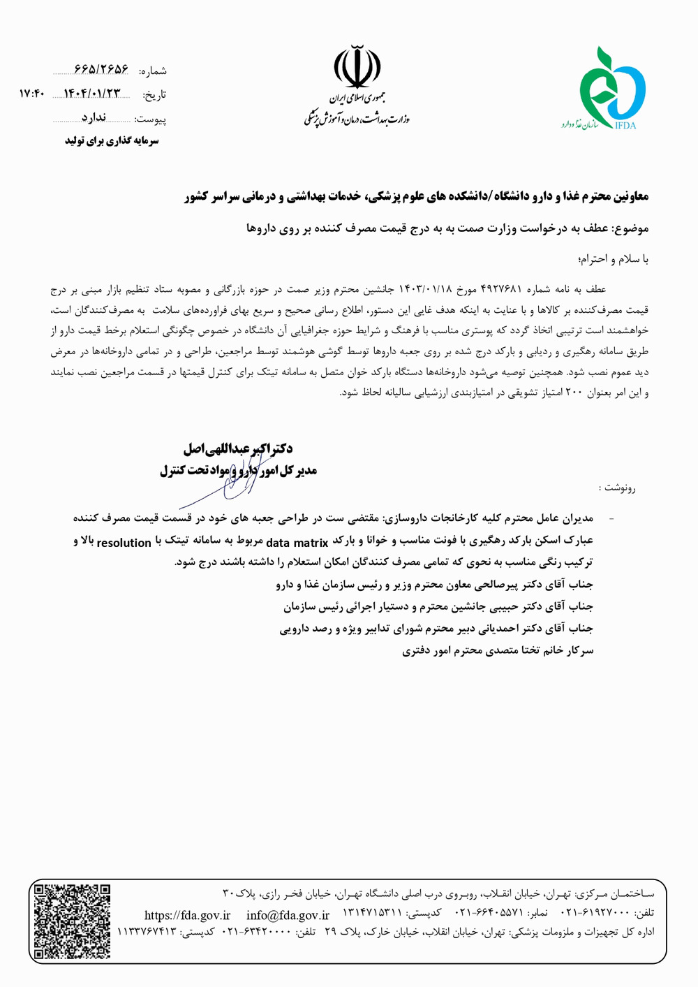 عطف به درخواست وزارت صمت به درج قیمت مصرف کننده بر روی داروها عطف به درخواست وزارت صمت به درج قیمت مصرف کننده بر روی داروها توسط مدیر کل امور دارو و مواد تحت کنترل اطلاع رسانی شد. دریافت عطف به درخواست وزارت صمت به درج قیمت مصرف کننده بر روی داروها کد خبر : 307095 کپی کلمات کلیدی عطف_به_درخواست_وزارت_صمت_به_درج_قیمت_مصرف_کننده_بر_روی_داروهامعاونت_غذا_و_دارو