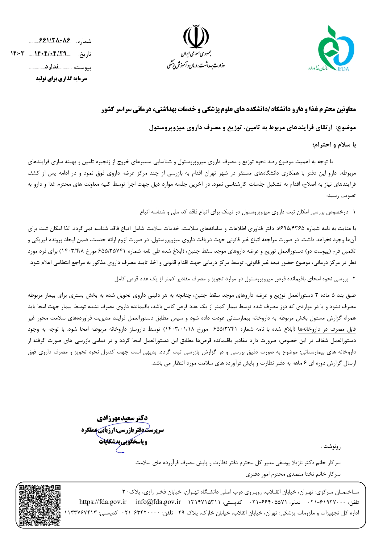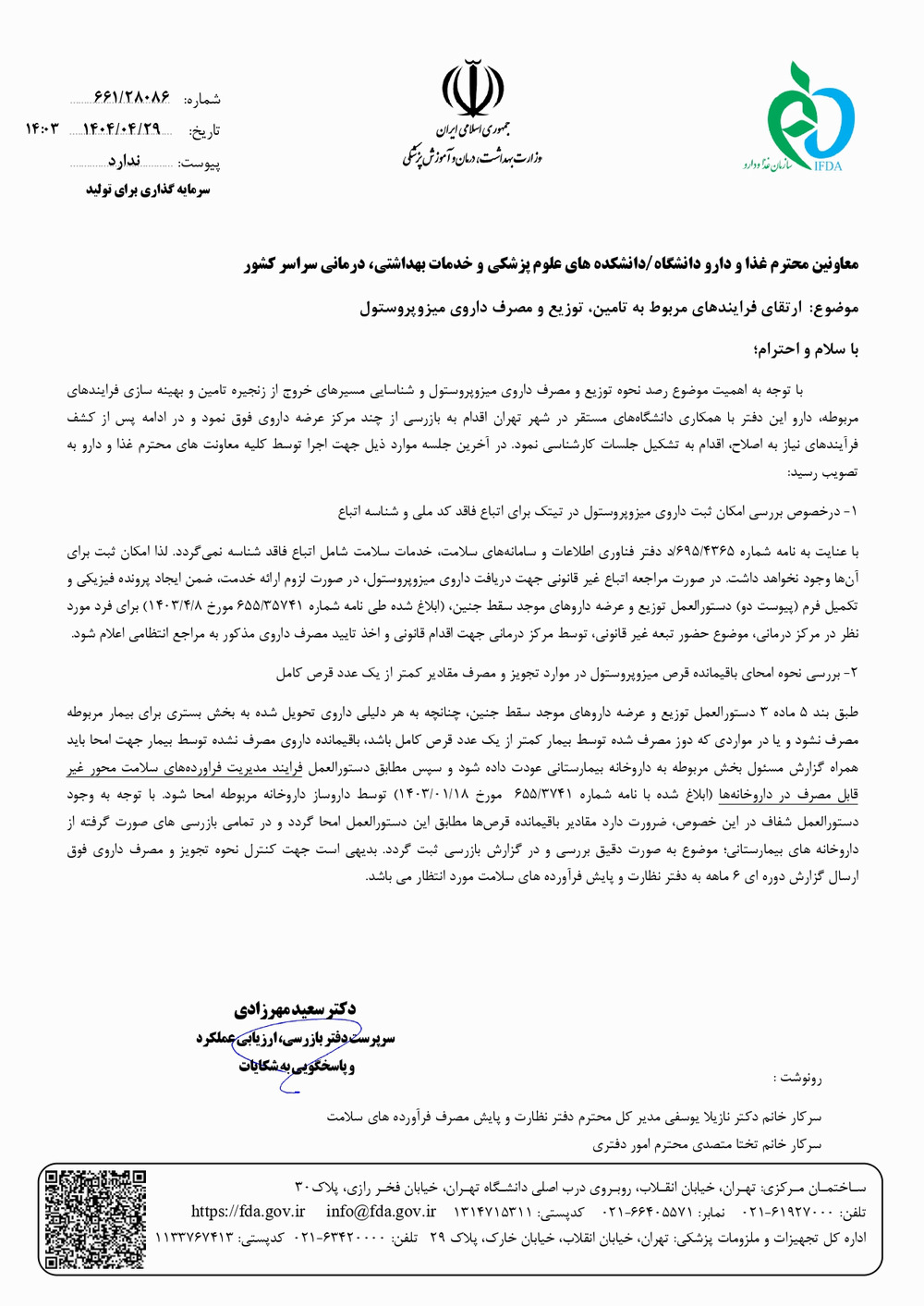 ارتقای فرایندهای مربوط به تامین، توزیع و مصرف داروی میزوپروستول توسط سرپرست دفتر بازرسی، ارزیابی عملکرد و پاسخگویی به شکایات اطلاع رسانی شد.