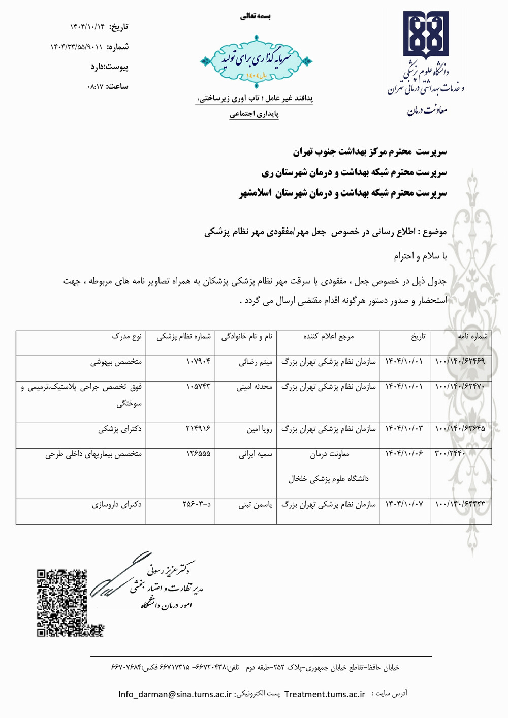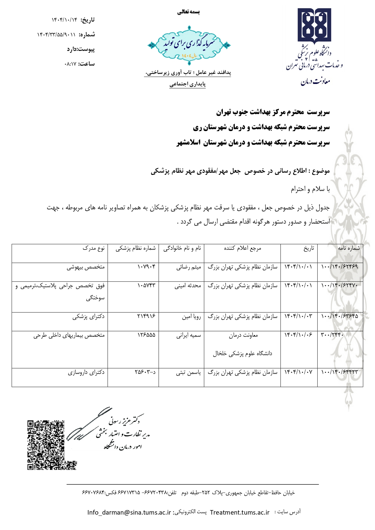 جعل مهر/ مفقودی مهر نظام پزشکی توسط مدیر نظارت و اعتباربخشی امور درمان دانشگاه اطلاع رسانی شد.