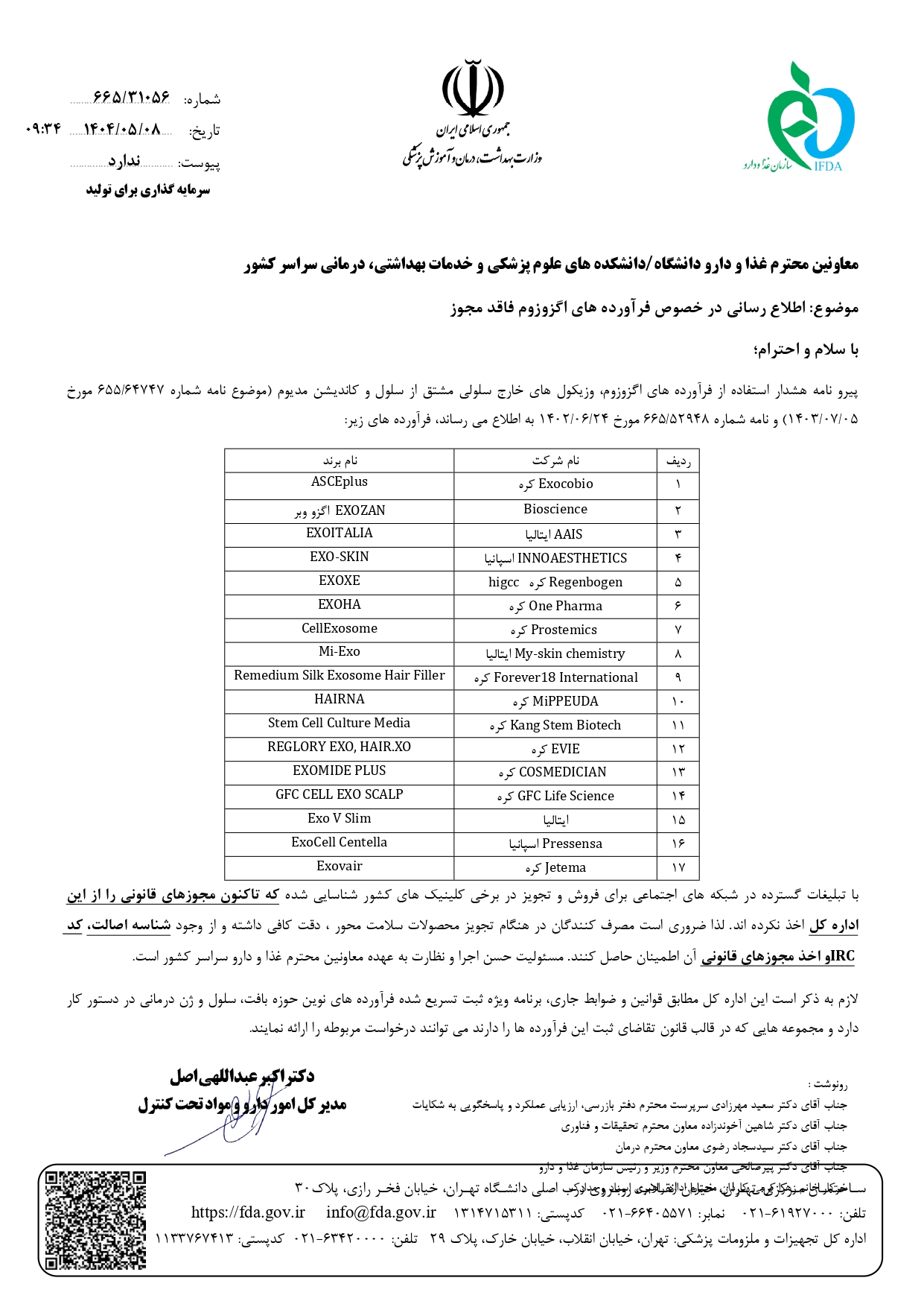 اطلاع رسانی در خصوص فرآورده های اگزوزوم فاقد مجوز