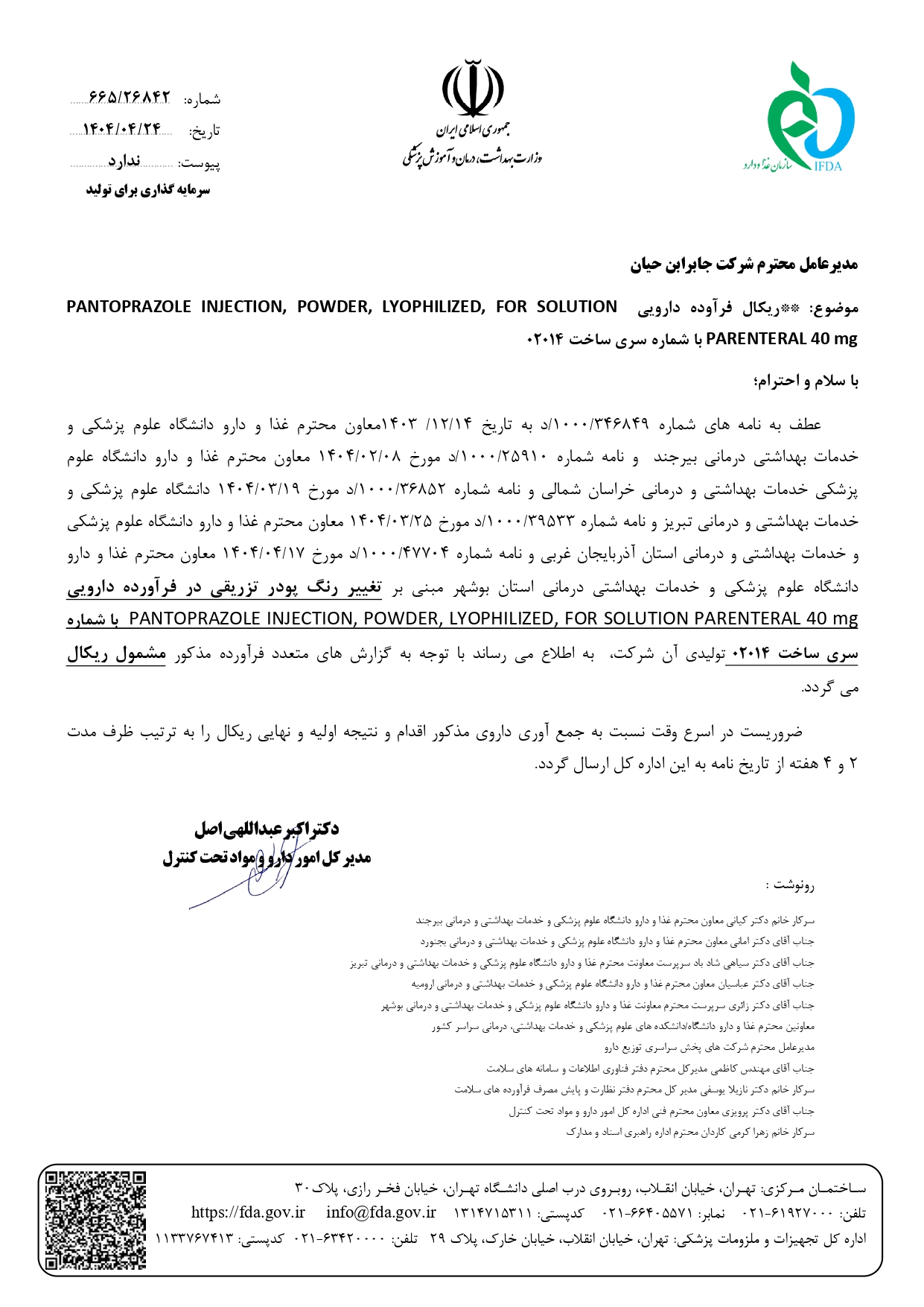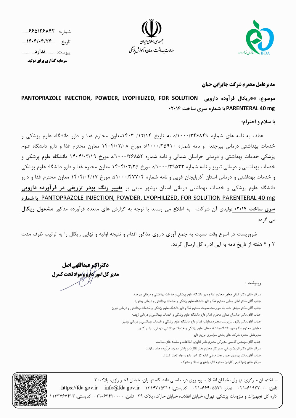 ریکال فرآورده دارویی PANTOPRAZOLE INJENTION,POWDER,LYOPHILIZED,FOR SOLUTION PARENTERAL 40