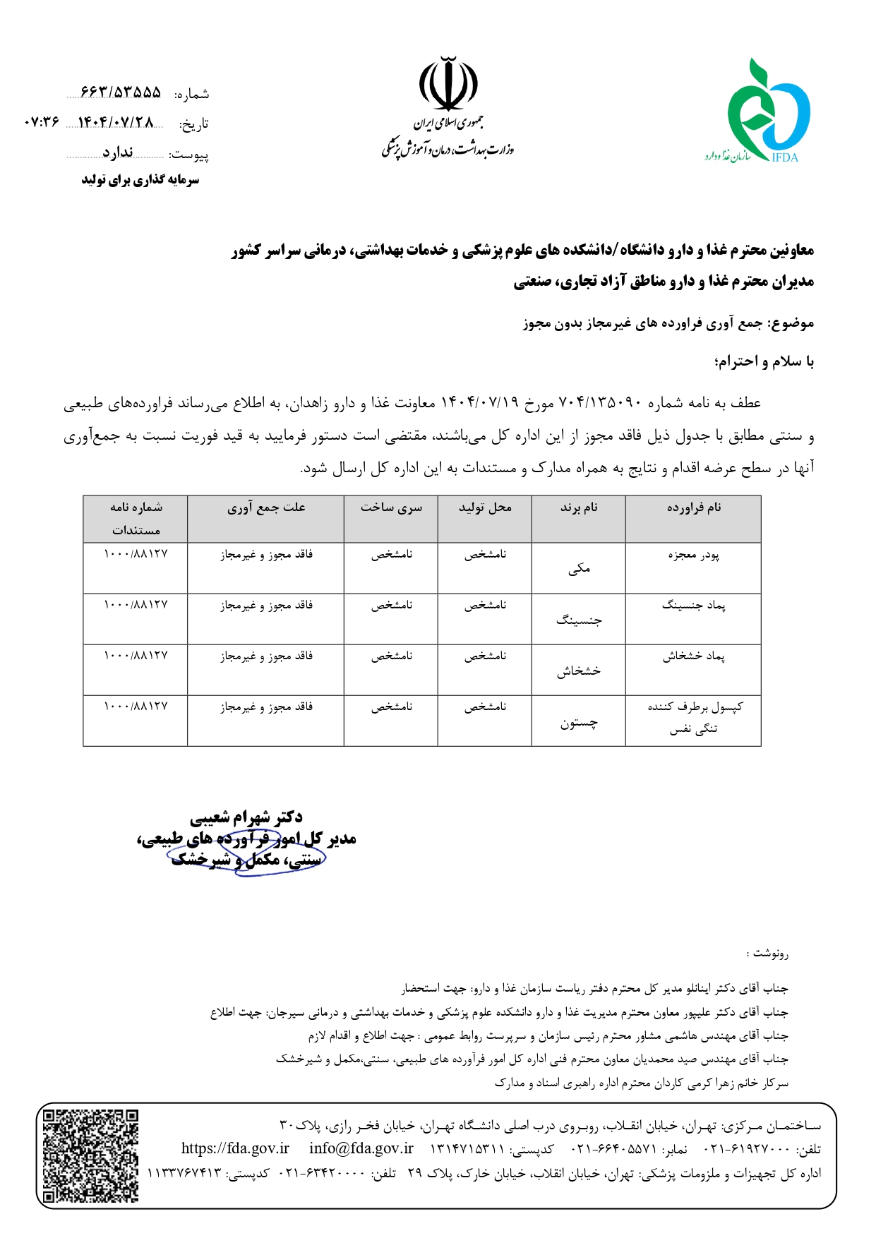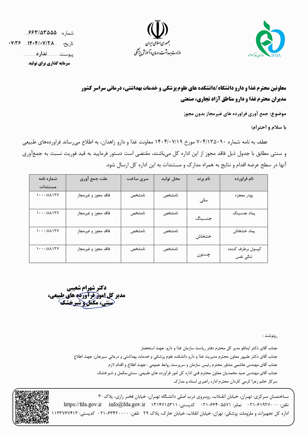 تاریخ انتشار : 1404/07/28 - 07:28 تعداد بازدید کنندگان خبر : 89 زمان مطالعه : کمتر از یک دقیقه ریکال فرآورده های غیر مجاز بدون مجوز ریکال فرآورده های غیر مجاز بدون مجوز توسط مدیر کل امور فرآورده های طبیعی، سنتی، مکمل و شیرخشک اطلاع رسانی شد. دریافت ریکال فرآورده های غیر مجاز بدون مجوز کد خبر : 307725 کپی کلمات کلیدی ریکال_فرآورده_های_غیر_مجاز_بدون_مجوزمعاونت_غذا_و_دارو تهیه کننده: ادمین دارو تصاویر لیست اخبار ارسال به دوستان متن داخل تصویر را وارد کنید *