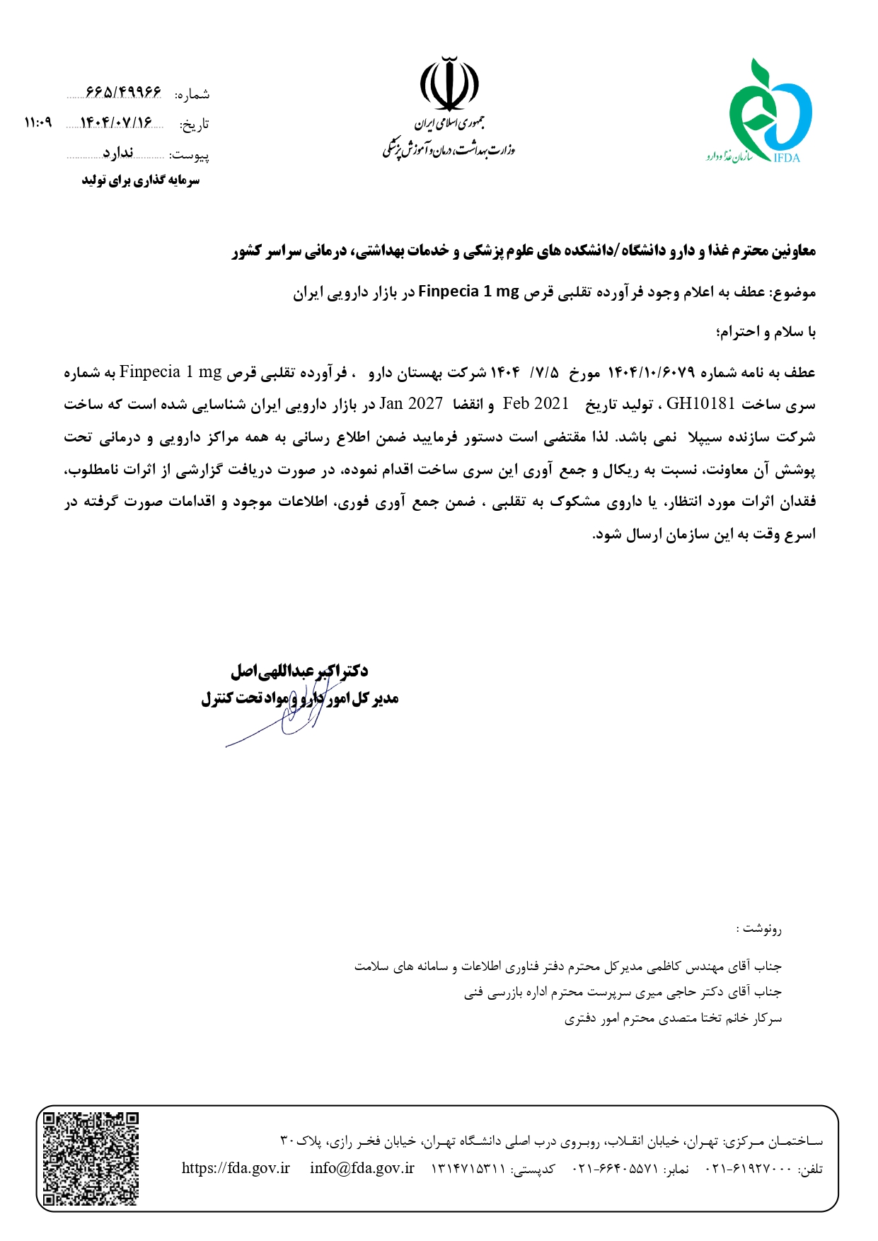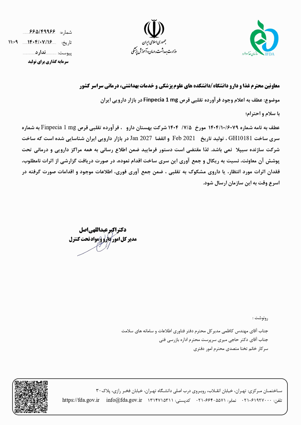 اعلام وجود فرآورده تقلبی قرص Finpecia 1 mg در بازار دارویی ایران توسط مدیر کل امور دارو و مواد تحت کنترل اطلاع رسانی شد.