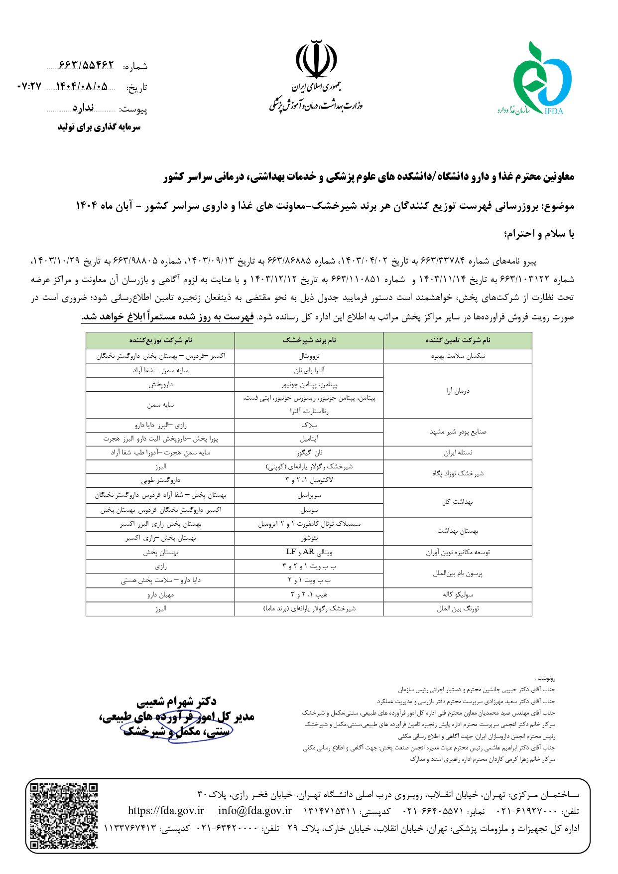 تاریخ انتشار : 1404/08/05 - 13:35 تعداد بازدید کنندگان خبر : 76 زمان مطالعه : کمتر از یک دقیقه بروزرسانی فهرست توزیع کنندگان هر برند شیر خشک آبان ماه 1404 فهرست به روز شده توزیع کنندگان هر برند شیر خشک از سوی دکتر شهرام شعیبی مدیر کل امور فرآورده های طبیعی، سنتی، مکمل و شیرخشک سازمان غذا و دارو ابلاغ شد. برای دریافت فایل کلیک کنید. کد خبر : 308361 کپی کلمات کلیدی بروزرسانی_فهرست_توزیع_کنندگان_هر_برند_شیر_خشکمعاونت_غذا_و_دارو تهیه کننده: ادمین مکمل تصاویر لیست اخبار ارسال به دوستان متن داخل تصویر را وارد کنید *