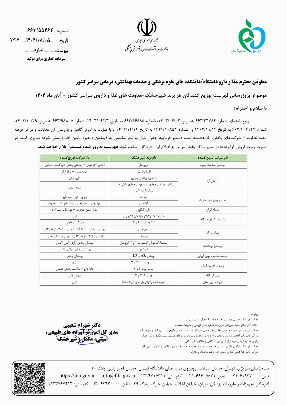 بروزرسانی فهرست توزیع کنندگان هر برند شیر خشک آبان ماه 1404 فهرست به روز شده توزیع کنندگان هر برند شیر خشک از سوی دکتر شهرام شعیبی مدیر کل امور فرآورده های طبیعی، سنتی، مکمل و شیرخشک سازمان غذا و دارو ابلاغ شد. برای دریافت فایل کلیک کنید. کد خبر : 308361 کپی کلمات کلیدی بروزرسانی_فهرست_توزیع_کنندگان_هر_برند_شیر_خشکمعاونت_غذا_و_دارو