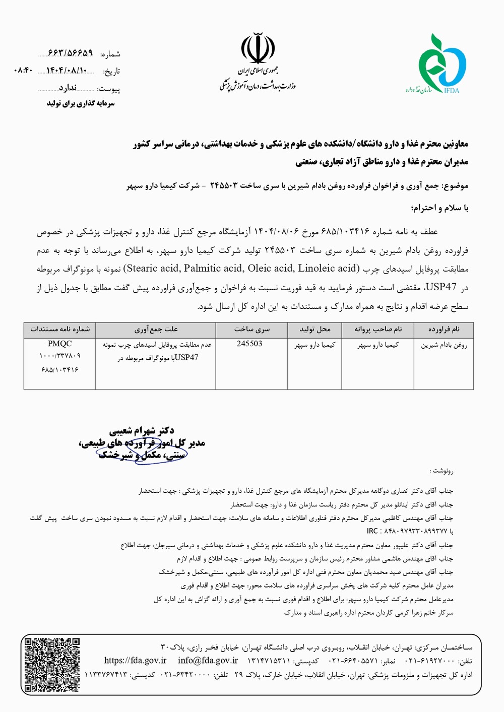 تاریخ انتشار : 1404/08/11 - 07:47 تعداد بازدید کنندگان خبر : 24 زمان مطالعه : کمتر از یک دقیقه جمع آوری فرآورده روغن بادام شیرین شرکت کیمیا دارو سپهر جمع آوری فرآورده روغن بادام شیرین با سری ساخت 245503 شرکت کیمیا دارو سپهر از سوی دکتر شهرام شعیبی مدیر کل امور فرآورده های طبیعی، سنتی، مکمل و شیرخشک سازمان غذا و دارو اطلاع رسانی شد. برای دریافت فایل کلیک کنید. کد خبر : 308858 کپی کلمات کلیدی جمع_آوریمعاونت_غذا_و_دارو تهیه کننده: ادمین مکمل تصاویر لیست اخبار ارسال به دوستان متن داخل تصویر را وارد کنید *