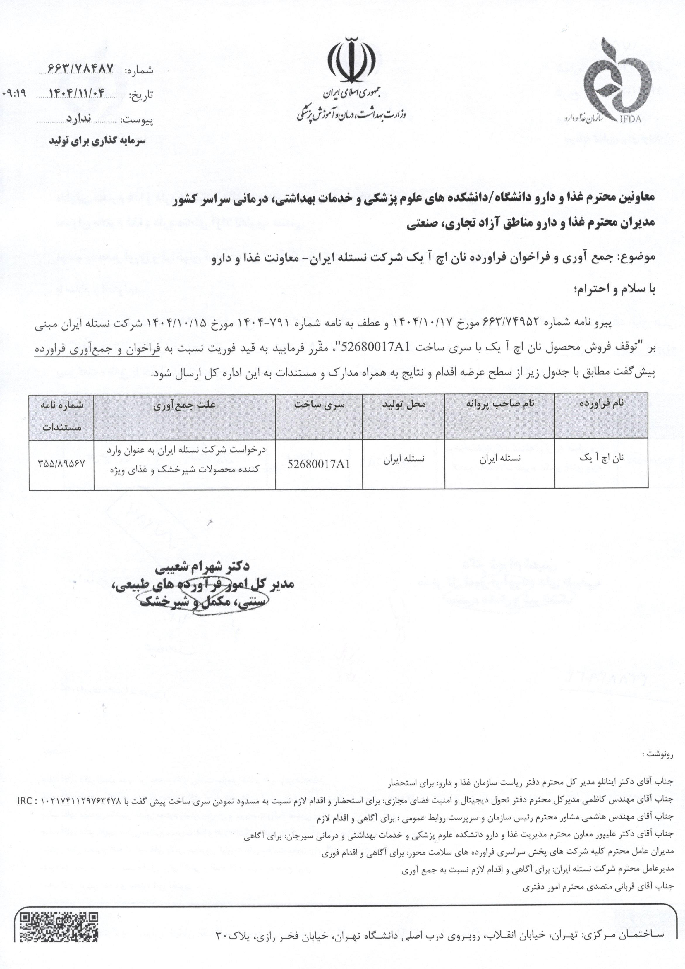 تاریخ انتشار : 1404/11/07 - 09:39 تعداد بازدید کنندگان خبر : 40 زمان مطالعه : کمتر از یک دقیقه جمع آوری فرآورده نان اچ آ یک شرکت نستله ایران جمع آوری فرآورده نان اچ آ یک شرکت نستله ایران با سری ساخت 52680017A1، از سوی دکتر شهرام شعیبی مدیر کل امور فرآورده های طبیعی، سنتی، مکمل و شیرخشک سازمان غذا و دارو اطلاع رسانی شد. برای دریافت فایل کلیک کنید. کد خبر : 314556 کپی کلمات کلیدی جمع_آوریفرآورده_نان_اچ_آ_یک_شرکت_نستله_ایرانمعاونت_غذا_و_دارو تهیه کننده: ادمین مکمل تصاویر لیست اخبار ارسال به دوستان متن داخل تصویر را وارد کنید *