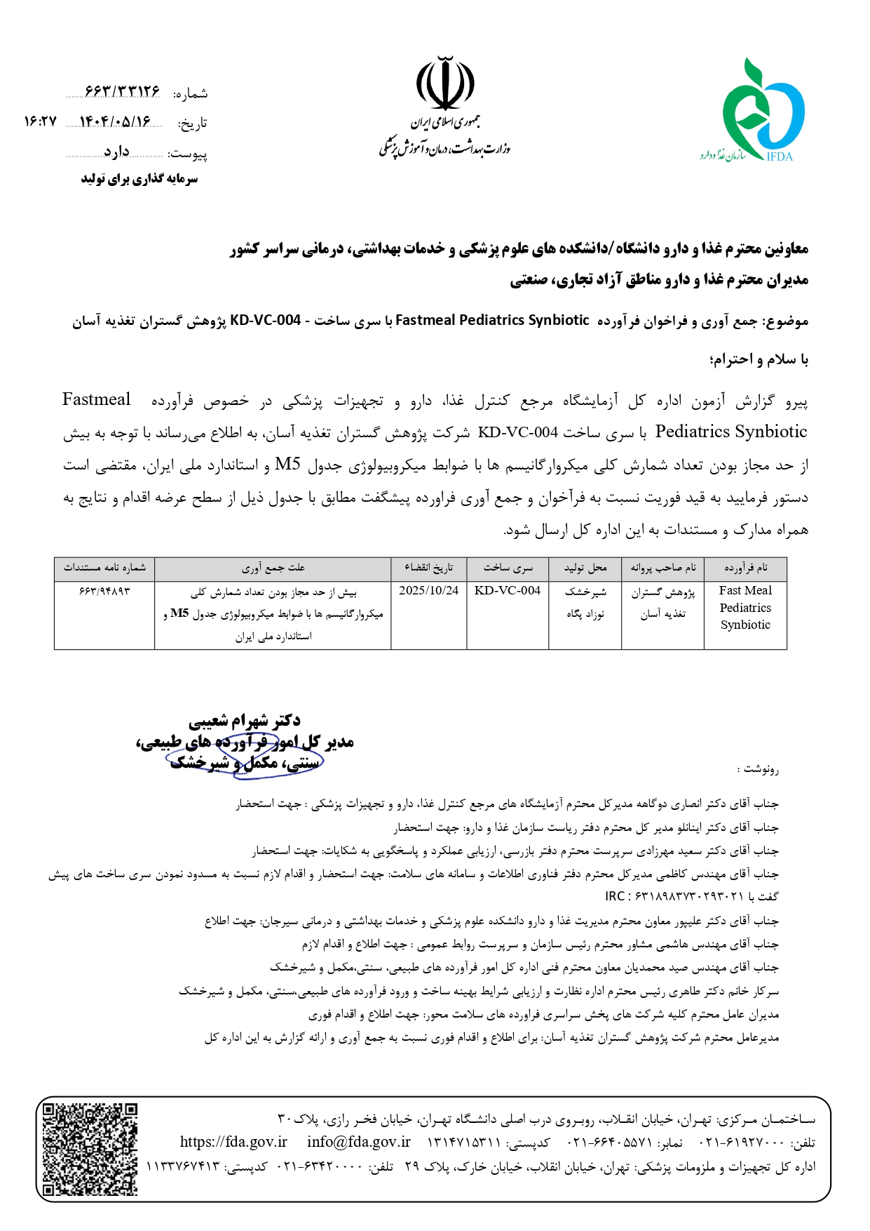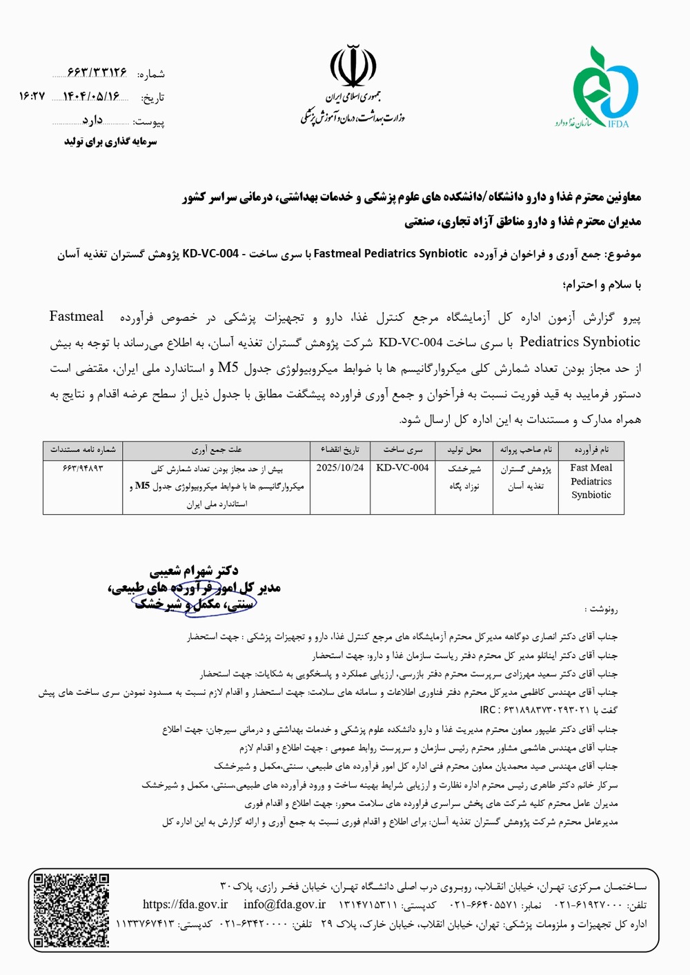 جمع آوری فرآورده Fastmeal Pediatrics Synbiotic با سری ساخت KD-VC-004 شرکت پژوهش گستران تغذیه آسان از سوی دکتر شهرام شعیبی مدیر کل امور فرآورده های طبیعی، سنتی، مکمل و شیرخشک سازمان غذا و دارو اطلاع رسانی شد.
