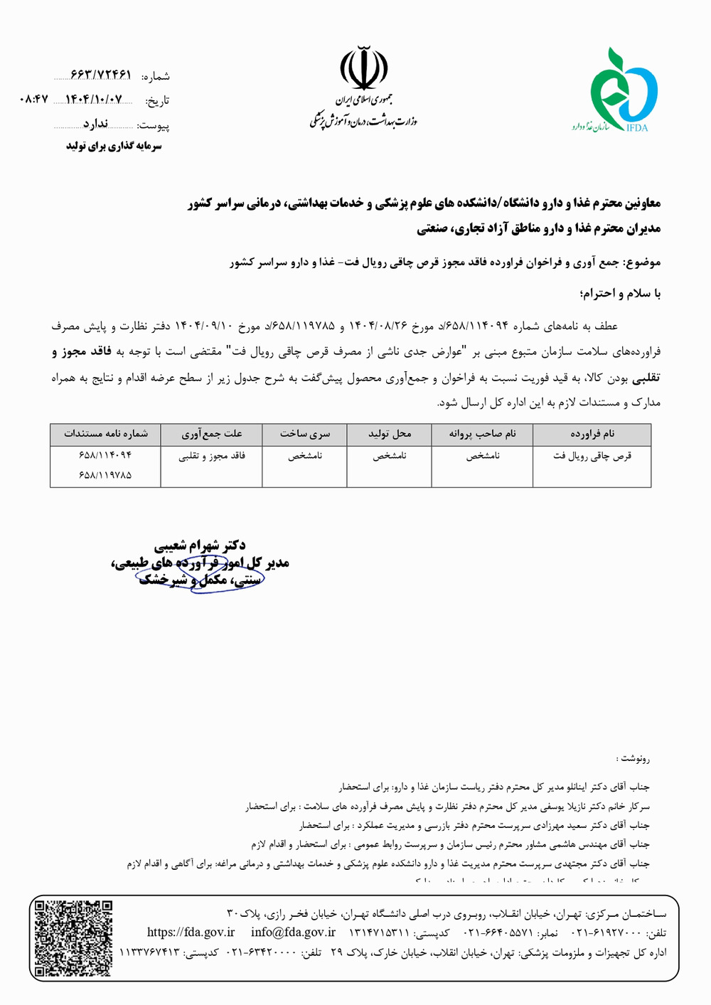 جمع آوری و فراخوان فرآورده فاقد مجوز قرص چاقی رویال فت جمع آوری و فراخوان فرآورده فاقد مجوز قرص چاقی رویال فت توسط مدیر کل امور فرآورده های طبیعی، سنتی، مکمل و شیرخشک اطلاع رسانی شد. دریافت جمع آوری و فراخوان فرآورده فاقد مجوز قرص چاقی رویال فت کد خبر : 313922 کپی کلمات کلیدی جمع_آوری_و_فراخوان_فرآورده_فاقد_مجوز_قرص_چاقی_رویال_فت_معاونت_غذا_و_دارو