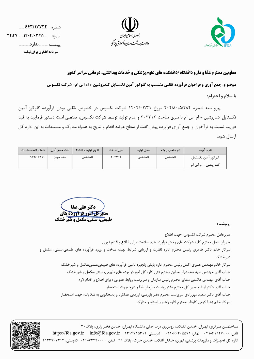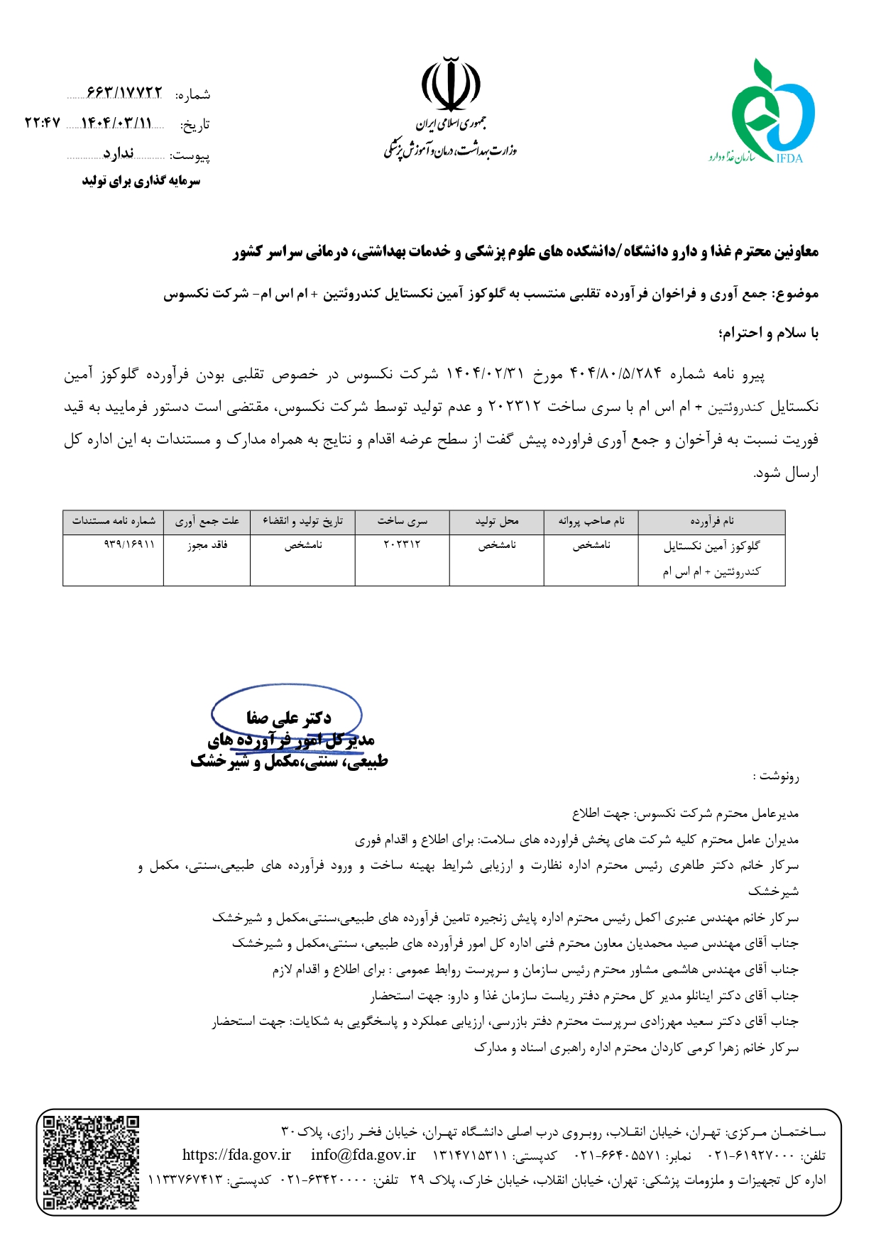 جمع آوری و فراخوان فراورده تقلبی منتسب به گلوکوز آمین نکستایل کندروئتین +ام اس ام شرکت نکسوس توسط مدیر کل امور فرآورده های طبیعی، سنتی، مکمل و شیرخشک اطلاع رسانی شد.