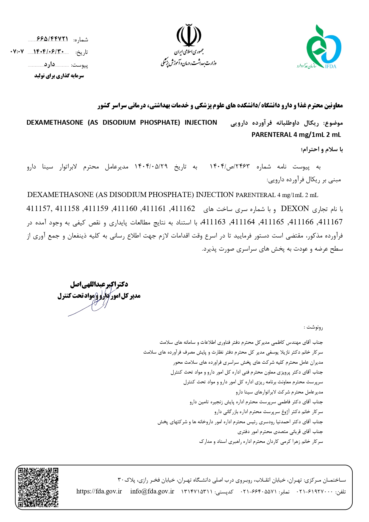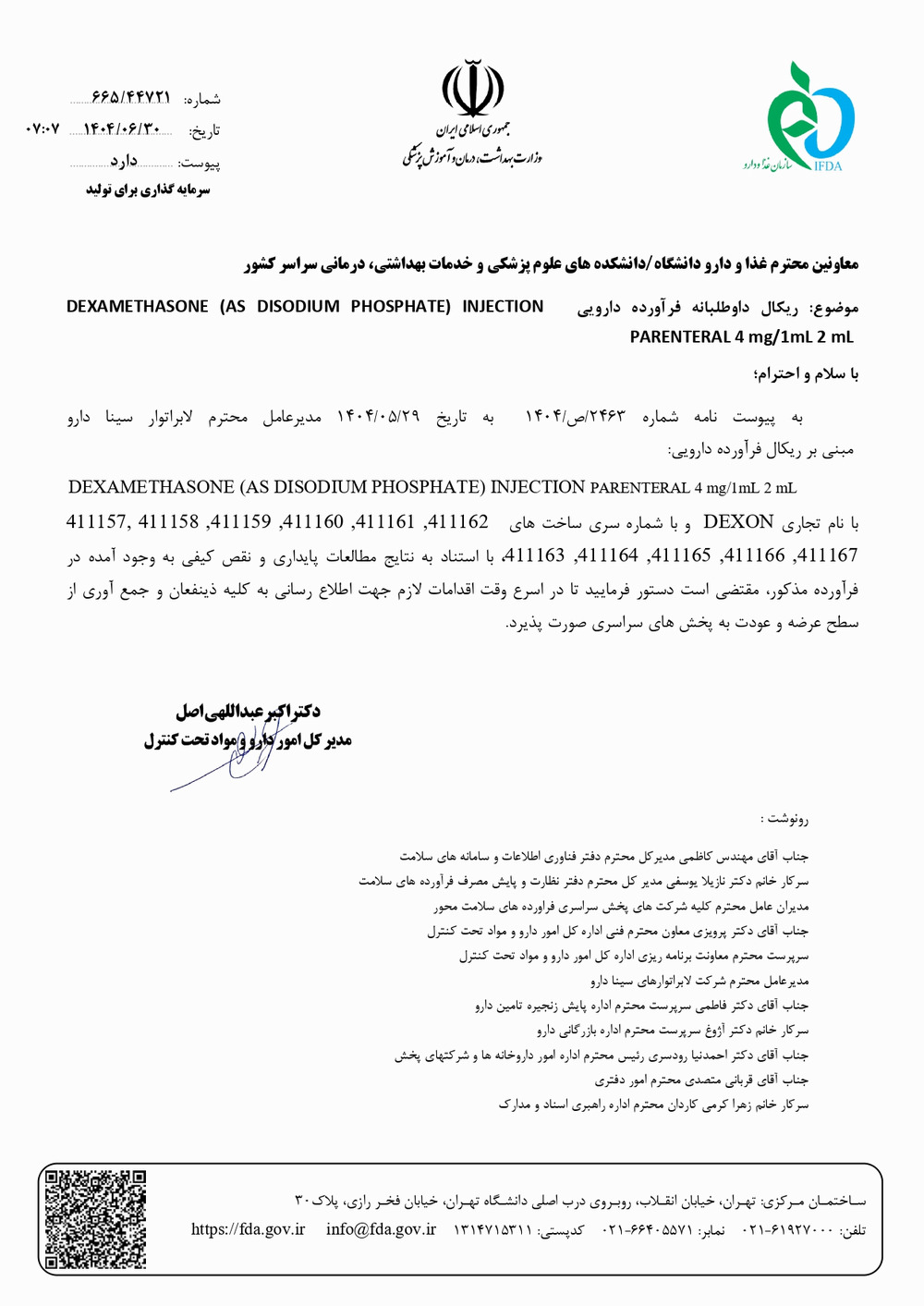 ریکال داوطلبانه فرآورده دارویی DEXAMETHASONE AS DISODIUM PHOSPHATE INJECTION PARENTERAL 4mg/1ml 2ml شرکت سینا دارو توسط مدیر کل امور دارو و مواد تحت کنترل اطلاع رسانی شد.