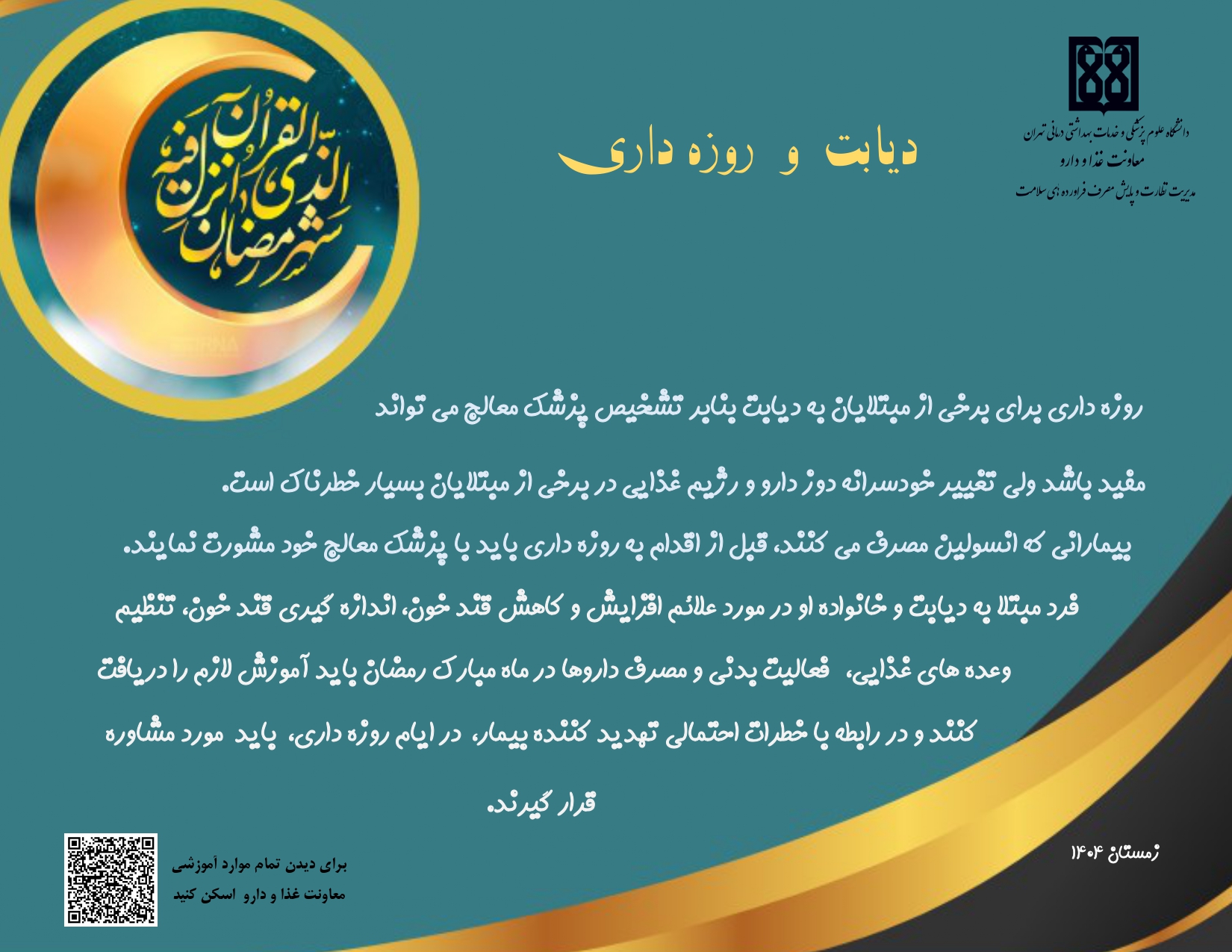 کد خبر : 315959 تاریخ انتشار : 1404/12/02 - 11:31 بازدیدکنندگان : 19 پوسترهای پزشکی و دارویی دیابت و روزه داری افراد مبتلا به دیابت در ماه مبارک رمضان داروهای خود را چگونه مصرف کنند؟ کپی